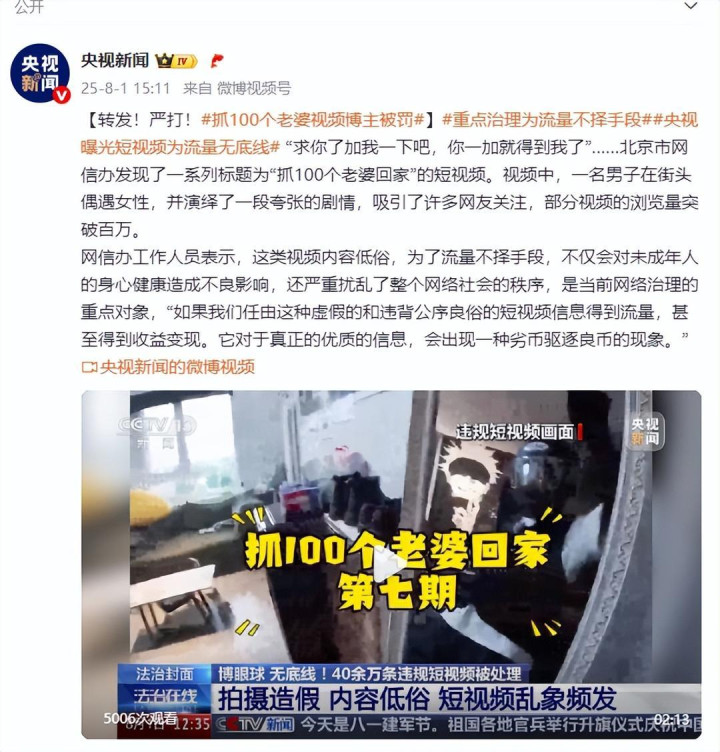 “求你了加我一下吧,你一加就得到我了”……北京市网信办发现了一系列标题为“抓100个老婆回家”的短视频。视频中,一名男子在街头偶遇女性深资管,并演绎了一段夸张的剧情,吸引了许多网友关注,部分视频的浏览量突破百万。