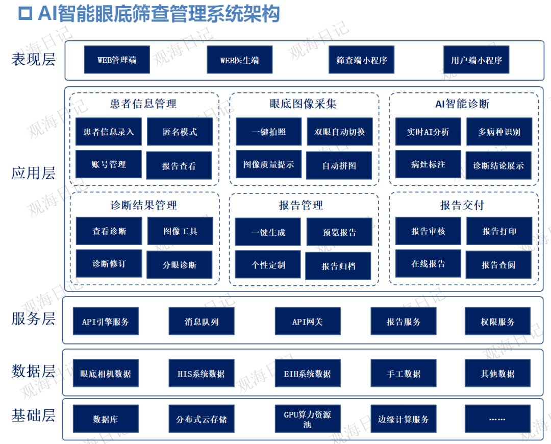 三、AI智能眼底筛查系统架构:三位一体AI智能眼底筛查管理系统是一个利用人工智能技术,对眼底照片进行自动化分析、风险评估和流程管理的软件平台,旨在实现大规模、高效、标准化的眼底疾病筛查。