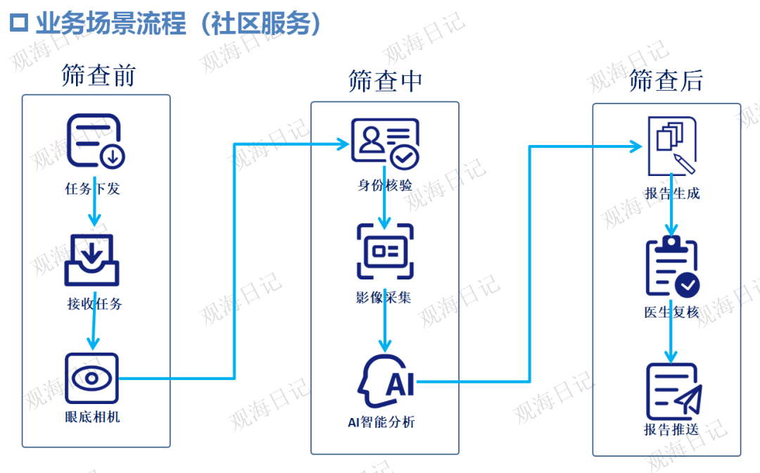 四、核心业务流程:简洁流畅,闭环管理AI智能眼底相机筛查在不同的医疗场景中,都有不同的使用方式,满足不同的医疗需求。