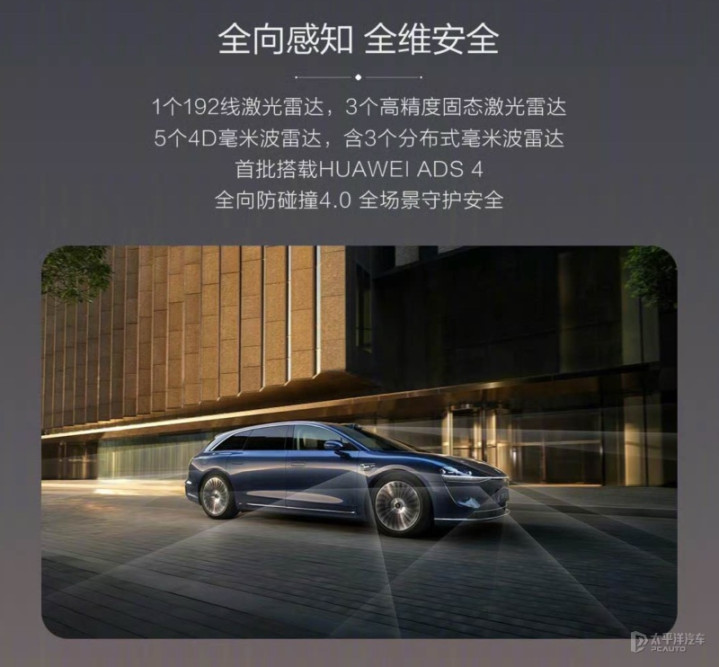 辅助驾驶方面,享界S9T首批搭载华为ADS4,配备1个192线激光雷达,3个高精度固态激光雷达、5个4D毫米波雷达(含3个分布式毫米波雷达)等辅助驾驶硬件,支持高速/城区领航辅助驾驶、智能泊车、全向防碰撞4.0等功能。