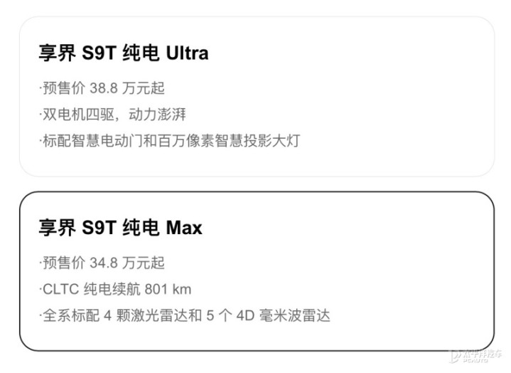 享界S9T纯电版提供单电机后驱和双电机四驱可选,其中后驱版搭载最大功率227千瓦驱动电机;四驱版系统综合功率385千瓦,百公里加速预计4秒。续航方面,全系匹配100千瓦时电池组,CLTC纯电续航分别为801km、765km和701km(四驱)。